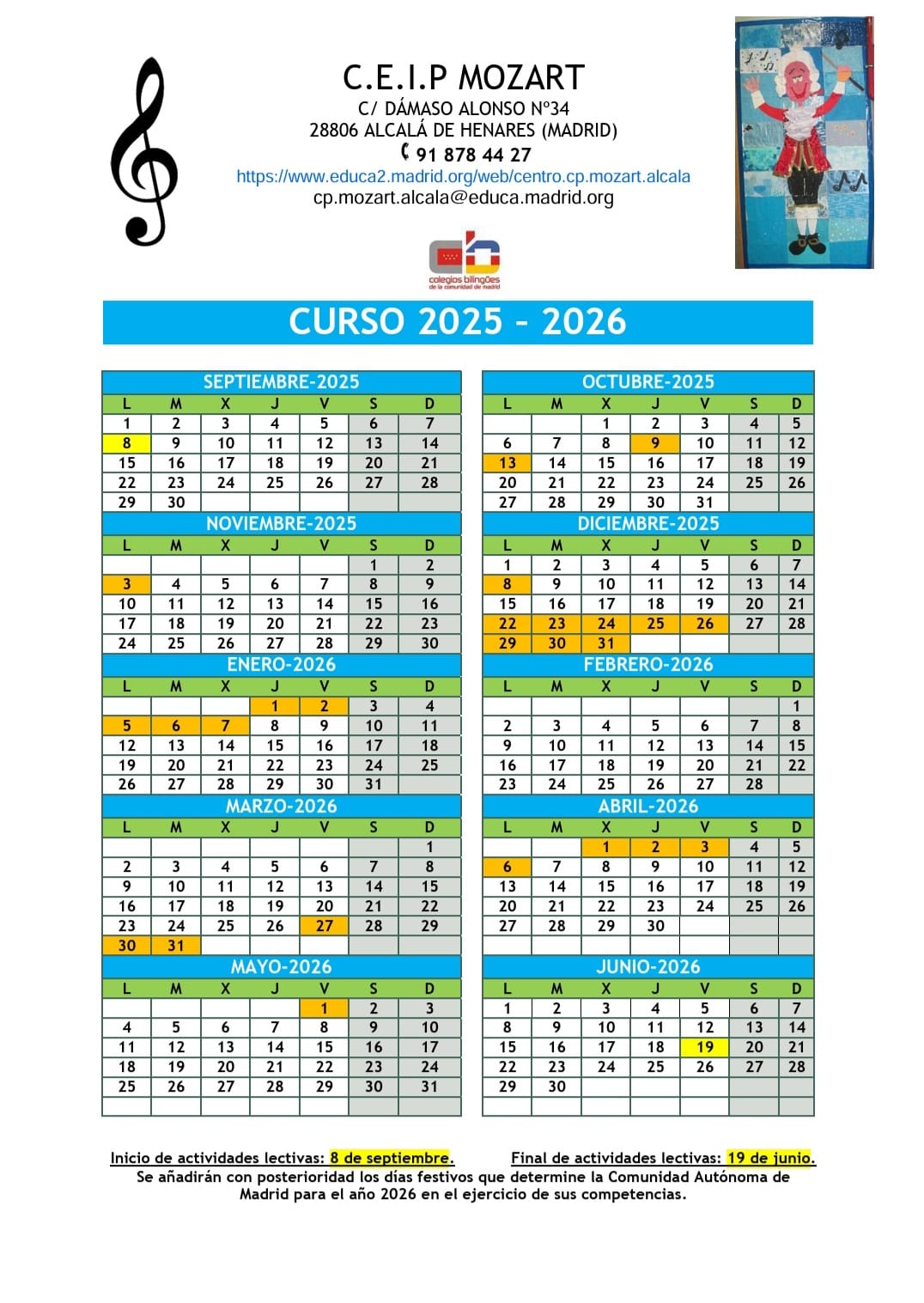 Dado que entrenamos en el pabellón del C.E.I.P. Mozart y que solo podemos entrenar los días lectivos,  es bueno conocer su calendario para este curso que acaba de empezar.