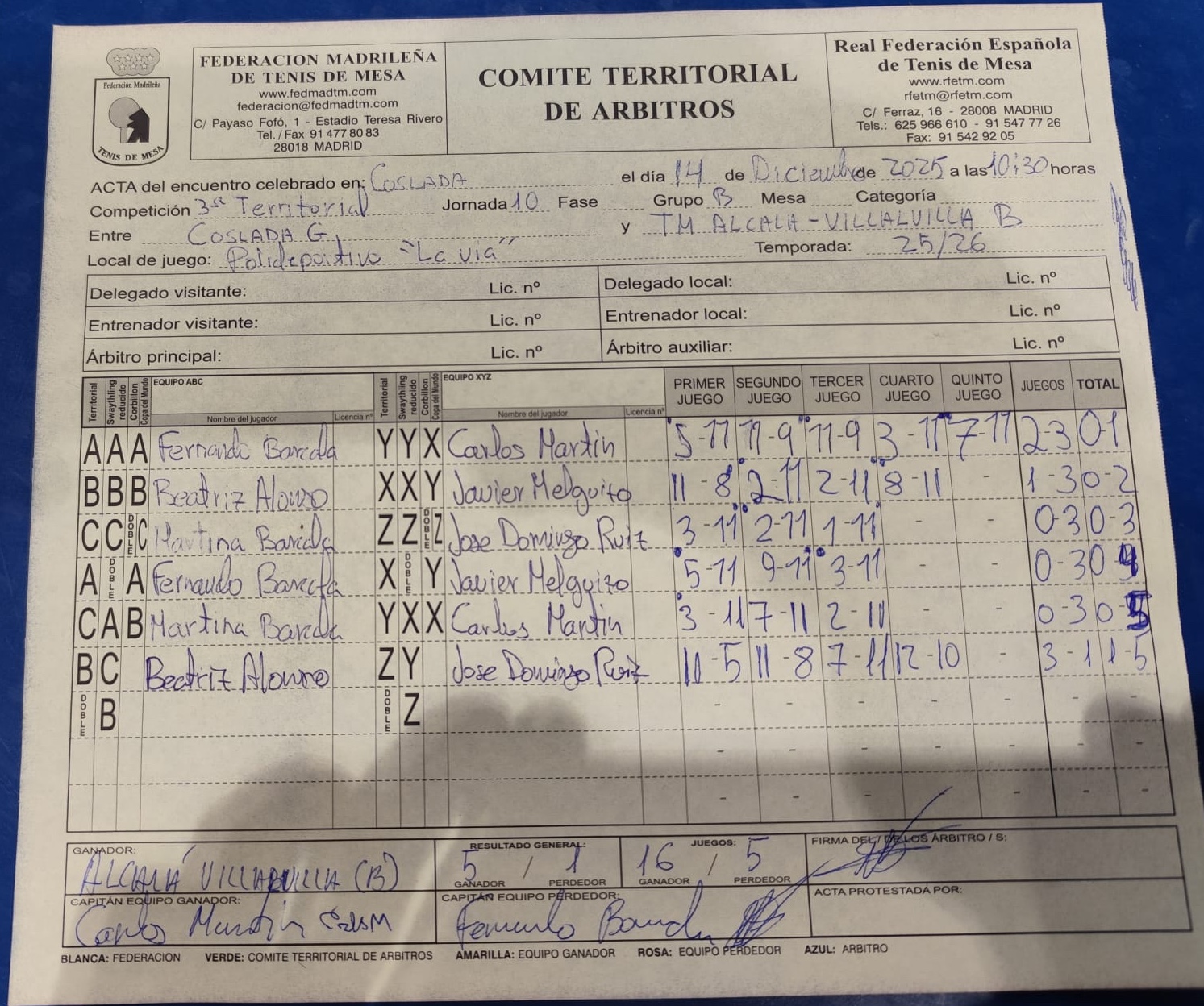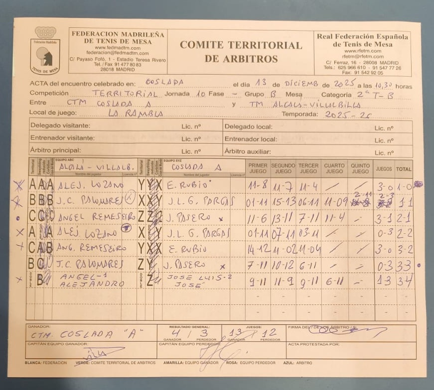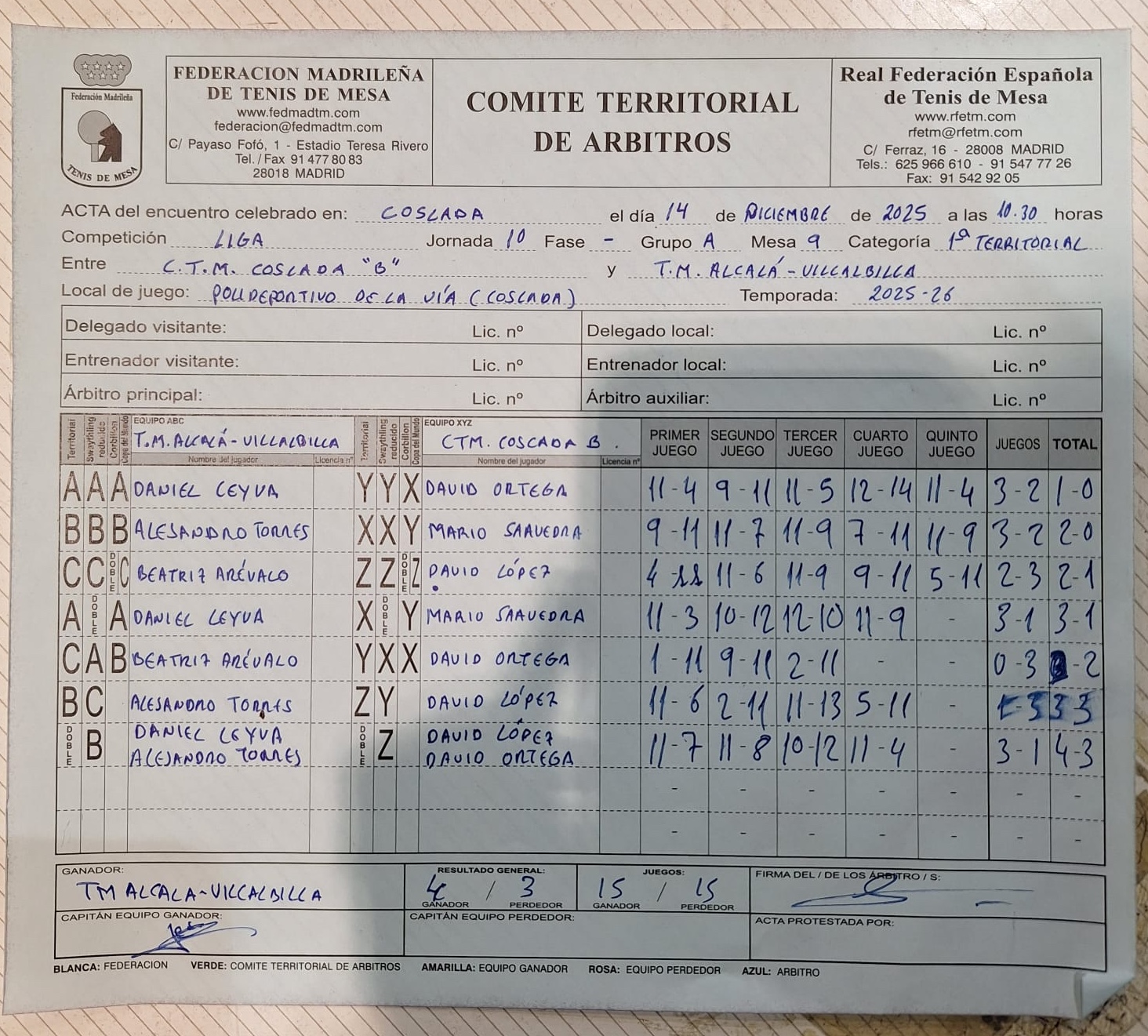 Jornada 10 1ª Territorial (A) CTM COSLADA «B» 3 TM ALCALÁ – VILLALBILLA 4 2ª Territorial (B) CTM COSLADA «A» 4 TM ALCALÁ – VILLALBILLA A 3 3ª Territorial (B) CTM COSLADA «G» 1 TM ALCALÁ – VILLALBILLA «B» 5 3ª Territorial (G) TM ALCALÁ – VILLALBILLA «A» 5 TM USERA 1