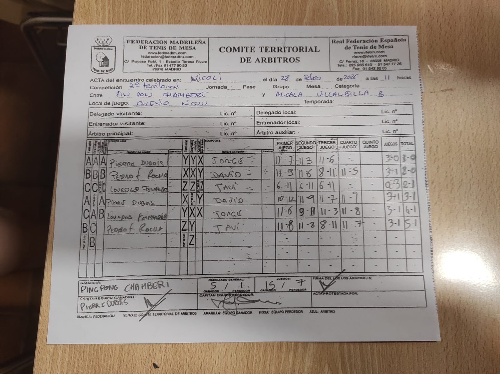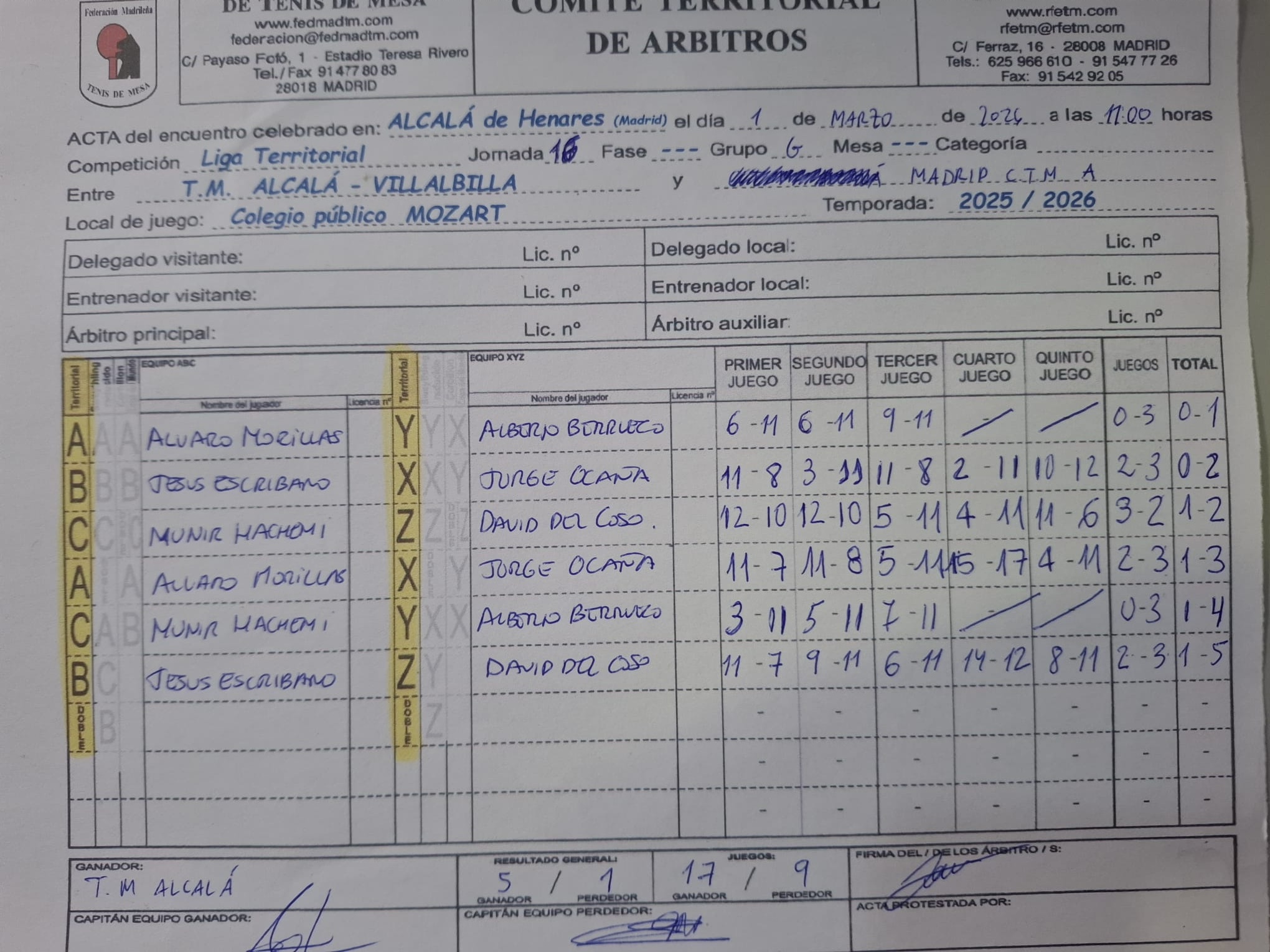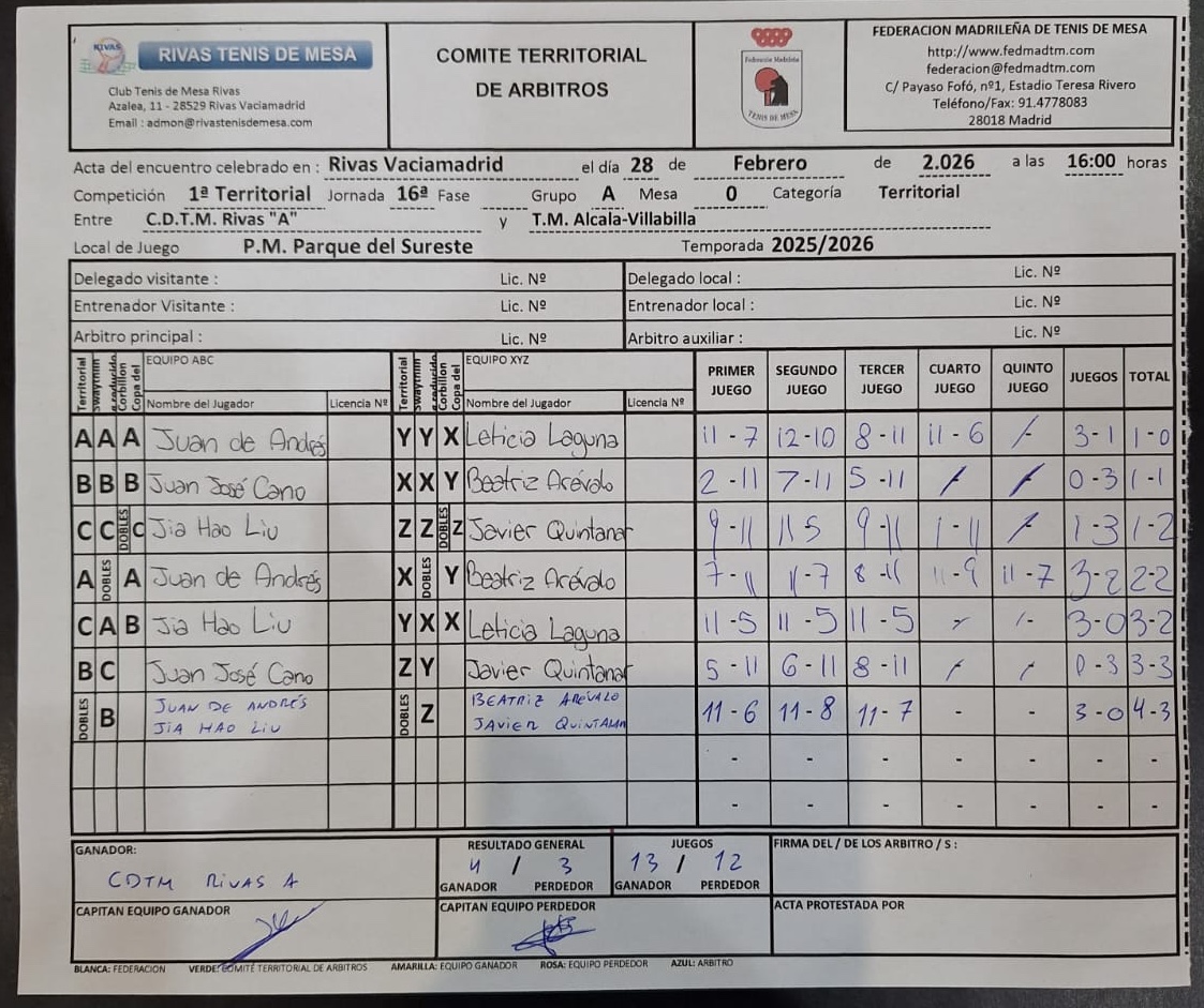 Jornada 16 1ª Territorial (A) CDTM RIVAS «A» 4 TM ALCALÁ – VILLALBILLA 3 2ª Territorial (B) FUENLABRADA TEAM 4 TM ALCALÁ – VILLALBILLA A 2 3ª Territorial (B) NICOLI-CHAMBERI TM 5 TM ALCALÁ – VILLALBILLA «B» 1 3ª Territorial (G) TM ALCALÁ – VILLALBILLA «A» 5 MADRID CTM «A» 1