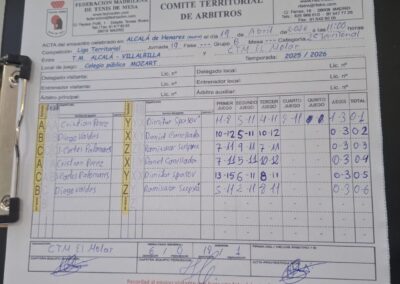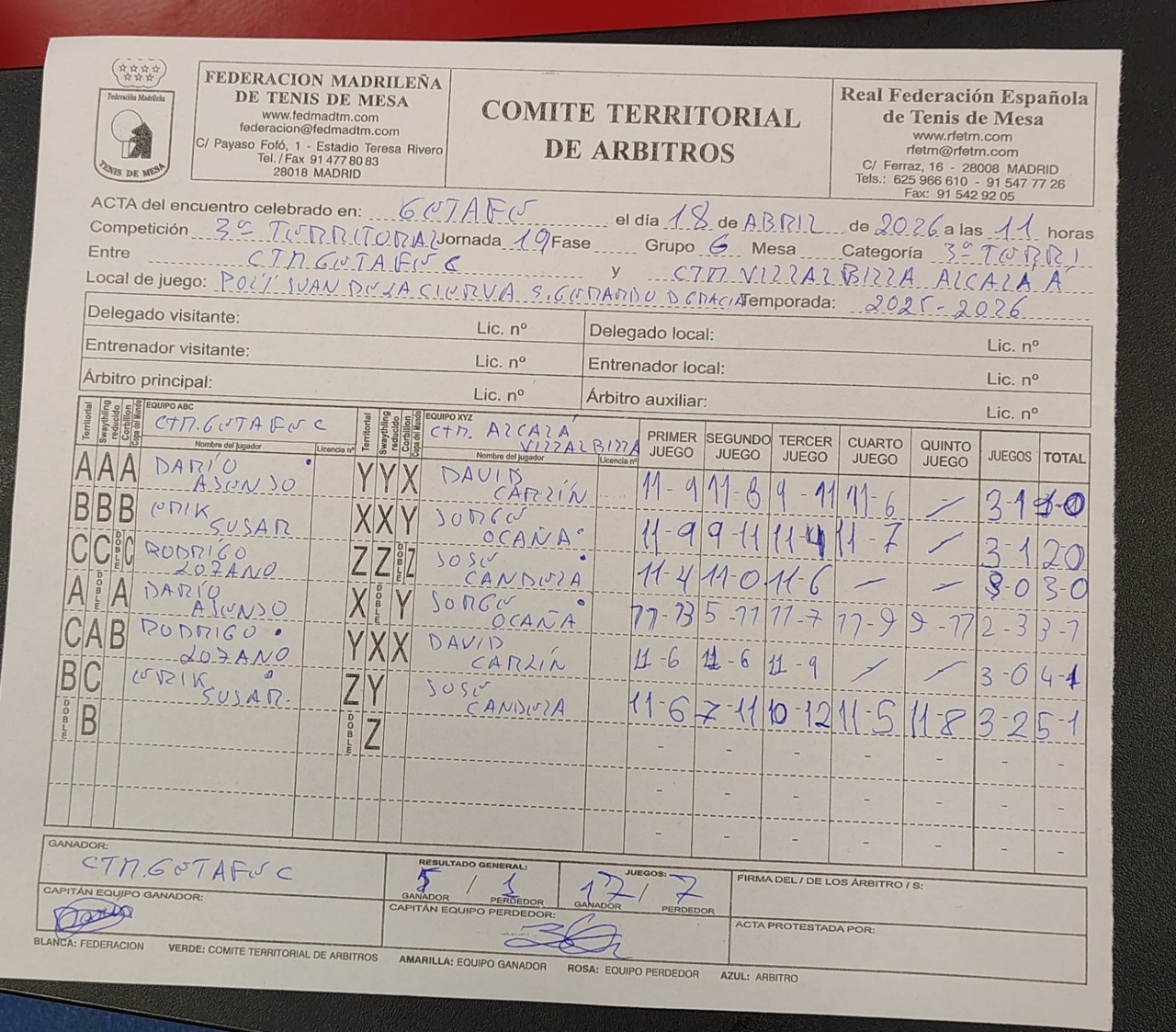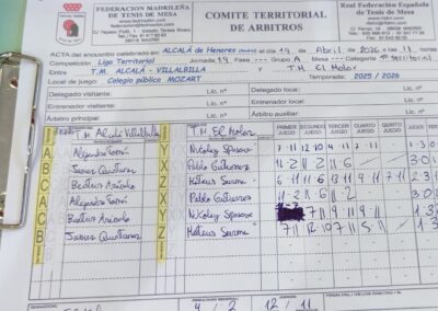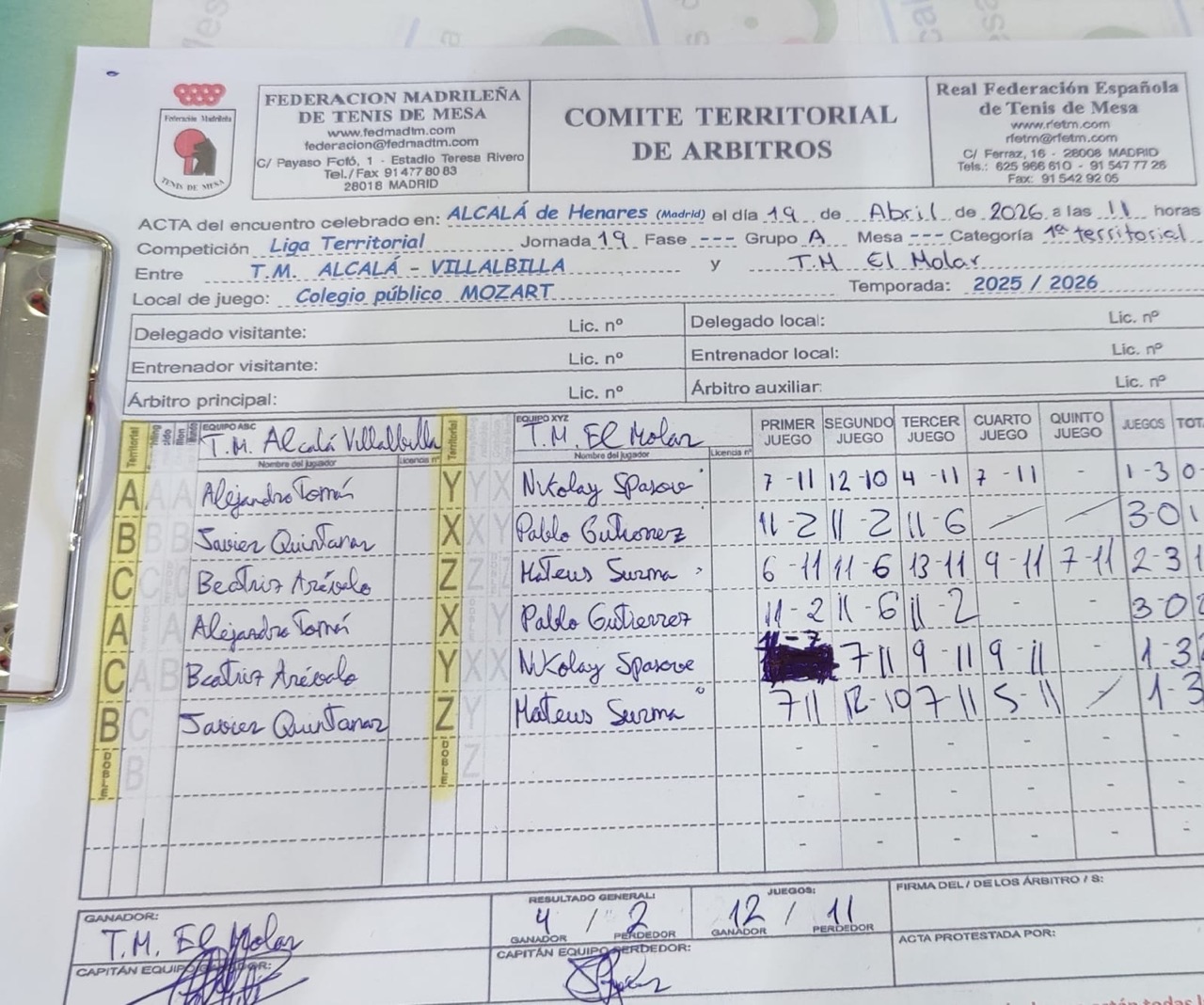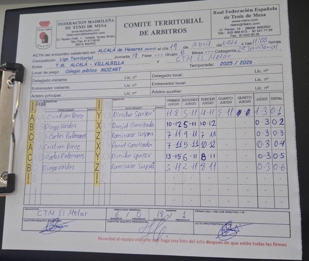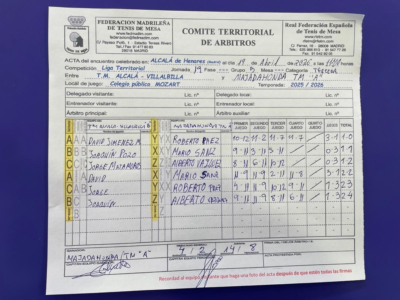 Jornada 19 1ª Territorial (A) TM ALCALÁ – VILLALBILLA 2 CTM EL MOLAR 4 2ª Territorial (B) TM ALCALÁ – VILLALBILLA A 0 CTM EL MOLAR 6 3ª Territorial (B) TM ALCALÁ – VILLALBILLA «B» 2 MAJADAHONDA TM «A» 4 3ª Territorial (G) CLUB TENIS DE MESA GETAFE «C» 5 TM ALCALÁ – VILLALBILLA «B» 1